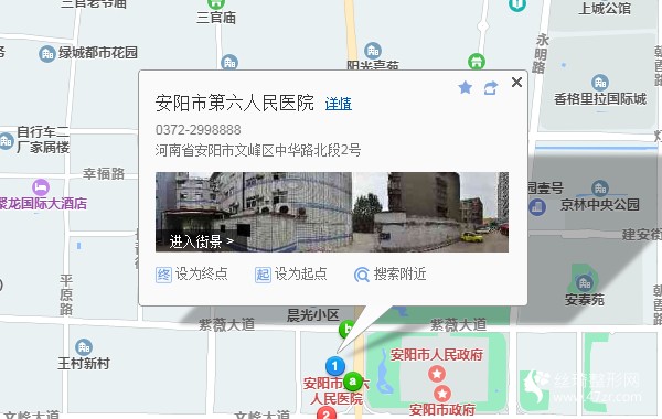 安陽站750米向東步行 到 文化宮8站乘 1路 (市人民醫(yī)院新院方向) 到 六醫(yī)院140米向東步行 到 安陽市第六人民醫(yī)院