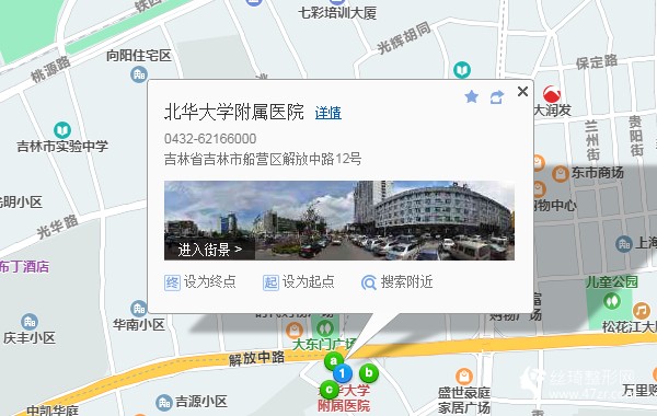 吉林站290米向西南步行 到 吉林站西廣場4站乘 45路 (農林街方向) 到 大東門160米向西南步行 到 北華大學附屬醫(yī)院