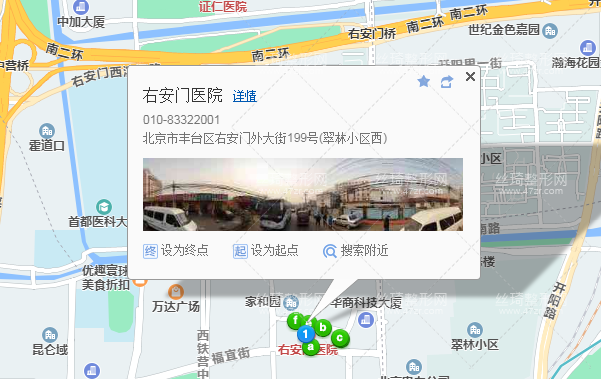 北京西站170米向北步行 到 北京西站 B東南入口進站3站乘 地鐵7號線 (花莊方向) 到 廣安門內(nèi) C2口(東南口) 出站320米向東步行 到 廣安門內(nèi)7站乘 19路 (翠林小區(qū)方向) 到 翠林小區(qū)370米向西步行 到 右安門醫(yī)院