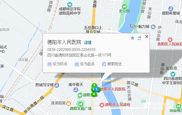 德陽站190米向北步行 到 火車站1站乘 泰山路快線 (汽車南站方向) 或28路 到 德陽市醫(yī)院180米向北步行 到 德陽市人民醫(yī)院