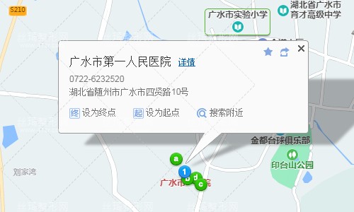 廣水市中心客運站410米向北步行 到 盛泰城4站乘 廣水2路 (八里岔方向) 或 廣水1路到 市一醫(yī)院30米向西南步行 到 廣水市第一人民醫(yī)院