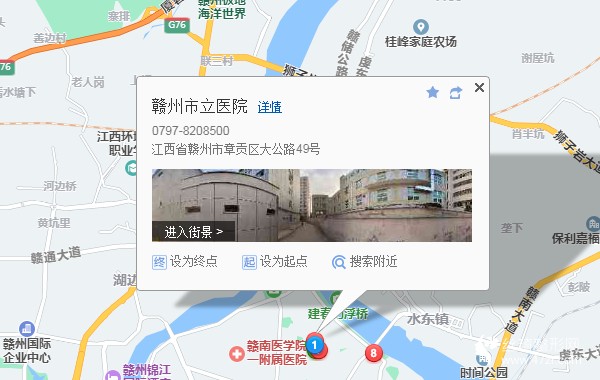 贛州站510米向西北步行 到 站前大道北1站乘 市人民醫(yī)院定制公交 (贛州市人民醫(yī)院方向) 或 102路 56路 到 貿易廣場3米站內換乘 8路6站乘 8路 (贛州汽車站方向) 或 8路 到 市立醫(yī)院4米向西南步行 到 贛州市立醫(yī)院
