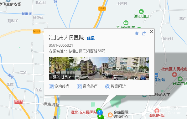 淮北北站1.5公里向西南步行 到 李樓村7站乘 3路 (鳳凰山開發(fā)區(qū)方向) 到 一中南門490米向北步行 到 淮北市人民醫(yī)院