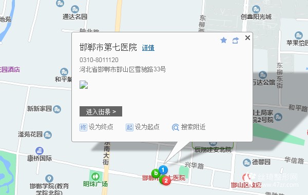 邯鄲汽車客運(yùn)總站270米向東北步行 到 大時(shí)代12站乘 303路 (高母方向) 到 縣醫(yī)院30米向東步行 到 邯鄲市第七醫(yī)院-整形美容科