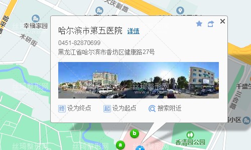 哈爾濱站150米向東北步行 到 哈站8站乘 101路 (汽輪機(jī)廠方向) 到 樂松廣場300米向東步行 到 哈爾濱櫥柜家具城4站乘 371路 (香坊大街(紅旗大街路口)方向) 或 67路 到 市五院50米向北步行 到 哈爾濱市第五醫(yī)院