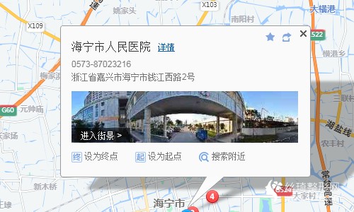 海寧站430米向南步行 到 海寧大廈北14站乘 海寧6路 (客運(yùn)中心方向) 到 衛(wèi)生管理中心(人民醫(yī)院南)60米向東步行 到 海寧市人民醫(yī)院