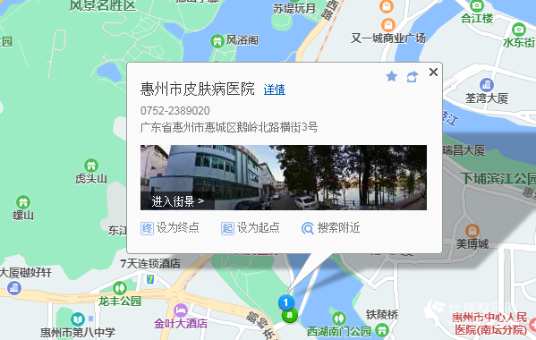 惠州站240米向東南步行 到 火車站19站乘 202路 (惠州一中東江學(xué)校北方向) 或 41路 29路 到 交投巴士公司430米向北步行 到 惠州市皮膚病醫(yī)院