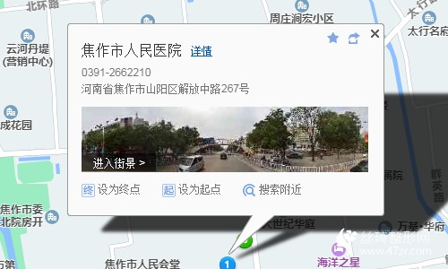 焦作站390米向北步行 到 火車站5站乘 7路區(qū)間 (宇航重工方向) 到 人民醫(yī)院120米向東步行 到 焦作市人民醫(yī)院