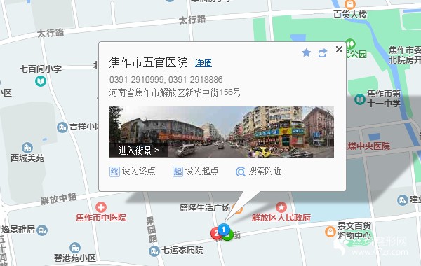 焦作站350米向北步行 到 火車站5站乘 30路 (紀(jì)念塔方向) 或 30路區(qū)間 到 市五官醫(yī)院南門110米向西北步行 到 焦作五官醫(yī)院