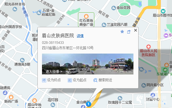 眉山站1.2公里向東步行 到 眉山東站6站乘 10路 (千禾大道(鄭店子)方向) 到 北門詩碑170米向西北步行 到 眉山皮膚病醫(yī)院