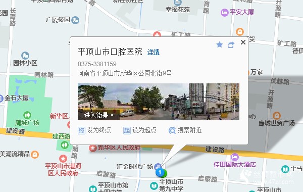 平頂山汽車站5米向北步行 到 聯(lián)通公司(新汽車站)3站乘 67路 (中興科技產(chǎn)業(yè)園方向) 到 平頂山飯店620米向南步行 到 平頂山市口腔醫(yī)院