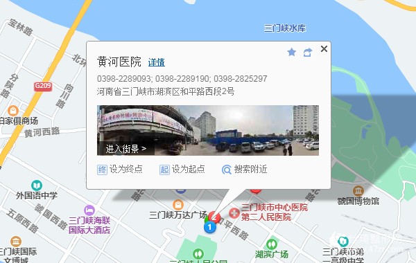 三門峽站150米向西南步行 到 火車站8站乘 迎賓1號公交專線 (高鐵南站方向) 或 9路 到 六峰路湖濱廣場690米向西北步行 到 黃河醫(yī)院
