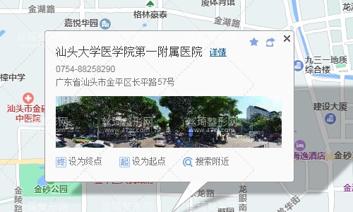 汕頭汽車總站170米向東南步行 到 汽車總站(杏花路)5站乘 28路 (新嘉雅園方向) 到 長平東廈路口260米向東步行 到 汕頭大學醫(yī)學院第一附屬醫(yī)院