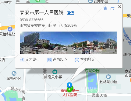 泰安站310米向東南步行 到 高鐵泰安站2站乘 游4路 (寶泰隆旅游度假區(qū)方向) 到 岱廟670米向西南步行 到 泰安市第一人民醫(yī)院。