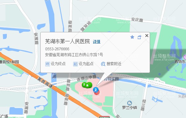蕪湖站940米向東南步行 到 站南路口17站乘 游2路 (方特夢幻王國方向) 到 第一人民醫(yī)院(東區(qū))90米向東步行 到 蕪湖市第一人民醫(yī)院整形科
