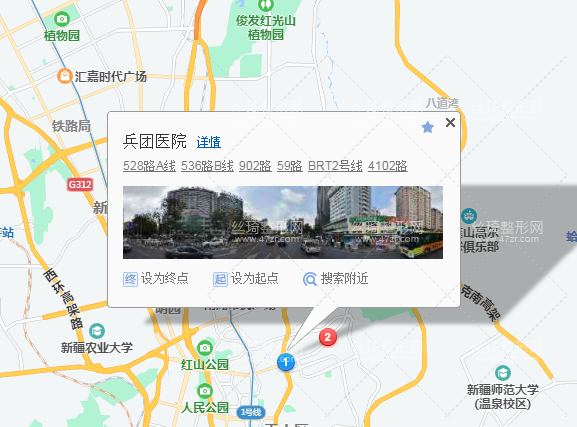 烏魯木齊站910米向西北步行 到 烏魯木齊站北廣場10站乘 BRT5路 (南湖東路方向) 到 軍區(qū)總醫(yī)院390米向東步行 到 友好路7站乘 BRT2號線 (紅橋方向) 到 兵團醫(yī)院50米向西步行 到 兵團醫(yī)院,