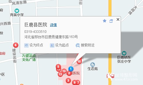 邢臺站300米向東步行 到 火車站6站乘 28路 (公交三公司方向) 到 市信訪局12米站內(nèi)換乘 908路17站乘 908路 (南宮汽車站方向) 到 巨鹿汽車站2.3公里向南步行 到 巨鹿縣醫(yī)院