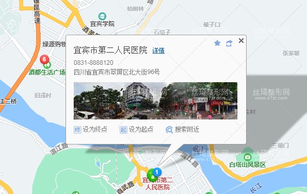 宜賓西門汽車客運站30米向西南步行 到 肛泰肛腸醫(yī)院西客站7站乘 1路 (正氣巷方向) 到 正氣巷250米向西北步行 到 宜賓市第二人民醫(yī)院整形科,