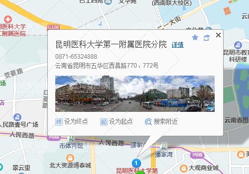 昆明汽車客運站910米向北步行 到 環(huán)城南路 B口 進站2站乘 地鐵2號線 (北部汽車站方向) 到 東風廣場2站乘 地鐵3號線 (西山公園方向) 到 潘家灣 A口 出站430米向西南步行 到 昆明醫(yī)科大學第一附屬醫(yī)院,