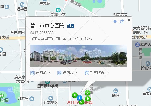 營口東站320米向北步行 到 營口東站12站乘 303路 (長途客運站方向) 或 303路柳樹 到 水務集團310米向東步行 到 建設銀行6站乘 9路 (國際商品交易中心方向) 到 中心醫(yī)院40米向西步行 到 營口市中心醫(yī)院,