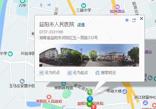 益陽站90米向西步行 到 火車站8站乘 11路 (箴言中學(xué)方向) 到 益陽圖書城740米向北步行 到 益陽市人民醫(yī)院
