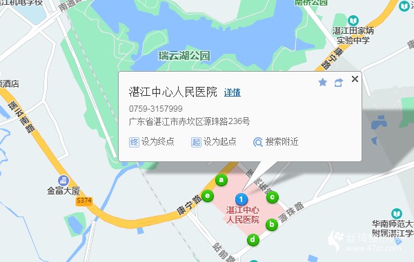 湛江站370米向東南步行 到 湛江汽車南站1站乘 海安-赤坎 (赤坎南橋車站方向) 到 赤坎南橋車站2.1公里向西南步行 到 湛江中心人民醫(yī)院