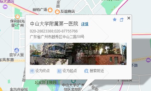 廣東省汽車客運站210米向東步行 到 廣州火車站 F口 進站3站乘 地鐵5號線 (文沖方向) 到 區(qū)莊130米向東步行 到 區(qū)莊1站乘 地鐵6號線 (潯峰崗方向) 到 東山口1站乘 地鐵1號線 (西塱方向) 到 烈士陵園 C口 出站450米向東步行 到 中山大學附屬第一醫(yī)院