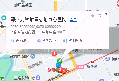 洛陽汽車站310米向南步行 到 金谷園路春晴路口4站乘 50路 (一五零醫(yī)院方向) 或 11路到 中國銀行洛陽分行(市中心醫(yī)院)80米向西南步行 到 鄭州大學附屬洛陽中心醫(yī)院