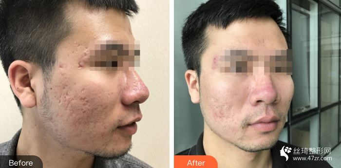 長期痘痘未清理形成的痘坑,前期先大面積清理痘痘,再通過療程點陣的方法改良面部痘坑及疤痕情況。