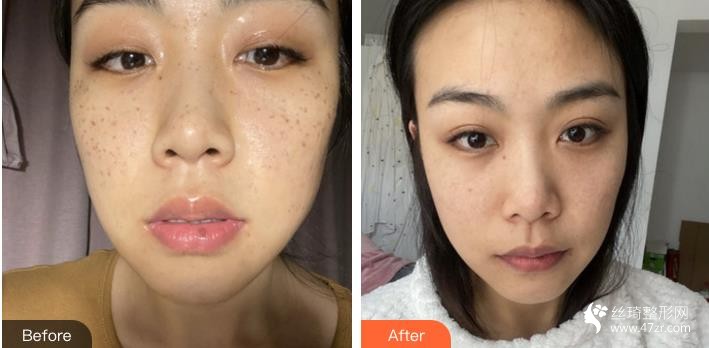 斑點(diǎn)已經(jīng)困了我好多年啦 現(xiàn)在終于鼓起勇氣來弄它們了。其實(shí)挺害怕的,但是一直因?yàn)槟樕嫌邪?,而且一年比一年?yán)重,心里真不是滋味。用過很多祛斑的產(chǎn)品,都沒有用。照了皮測(cè),醫(yī)生說是混合性色素斑。今天剛做了一次,做的時(shí)候眼睛被罩住的,只感覺臉上刺刺熱熱的,然后做完交待了一些注意事項(xiàng),就輕松結(jié)束了?,F(xiàn)在還沒看出來果