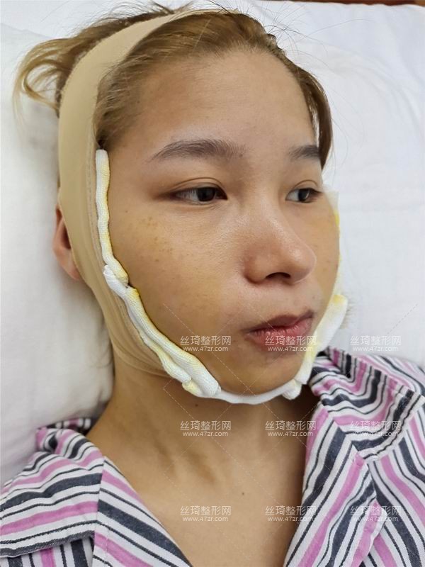 手術(shù)結(jié)束后,我的第一感覺是臉腫得很厲害,而且因為蒙著頭罩,很緊張。好在護士很快過來告訴我手術(shù)進行的很順利,讓我的心輕松了很多,然后告訴我,我現(xiàn)在穿的頭罩也是為了下巴,一定不要摘下來,需要戴一周左右。因為手術(shù),人有點暈,但是感謝護士的細心照顧,我在護士的幫助下做了很多麻煩的事,挺溫暖的。