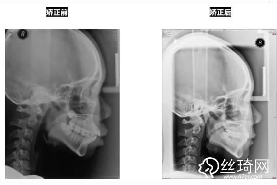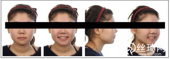 正面觀突度改良,面部肌肉自然松馳,開唇露齒已糾正,唇齒關(guān)系改良;側(cè)貌明X改良,趨于直面型,頦部自然松馳。