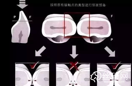 牙齒鄰面終止線的位置要依據(jù)鄰牙接觸類型決定,如果鄰牙的接觸面積比較小,鄰面預(yù)備只要稍微進入接觸區(qū)即可;如果鄰牙的接觸面積比較大,鄰面預(yù)備接觸區(qū)域的一半即可,不能再深了;